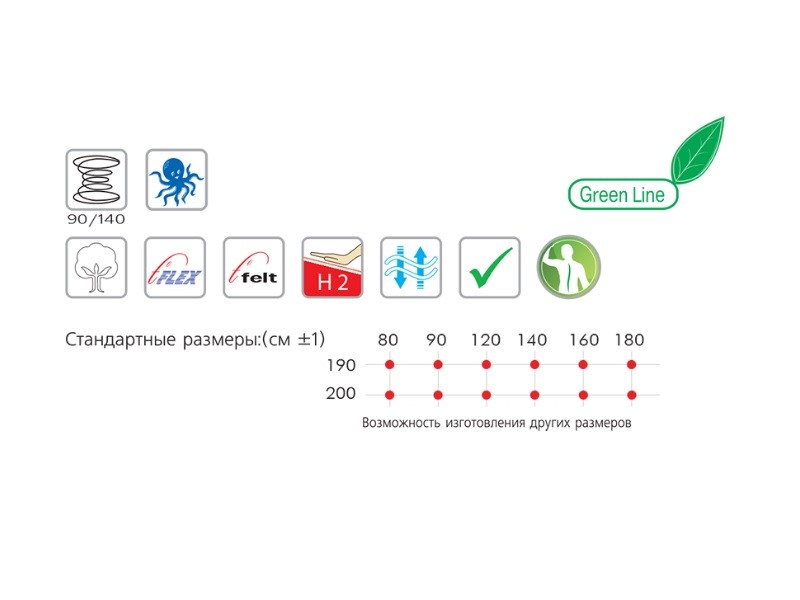 | Размер матраса, см: | 180х200, 140х190, 120х200, 120х190, 90х200, 90х190, 80х200, 80х190 |