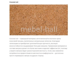 - Coconut coir природный материал, изготовленный из волокон ореха кокосовой пальмы, пропитанных натуральным латексом. Благодаря латексации он приобретает дополнительную прочность, высокую износостойкости и выдерживает большие нагрузки. Применение материала в составе матраса делает его более жестким и наделяет эффектом 2в1, поэтому у вашего матраса будет разносторонняя жесткость. Если у вас изменятся потребности и предпочтения по жесткости и комфортности достаточно просто перевернуть матрас на другую сторону.