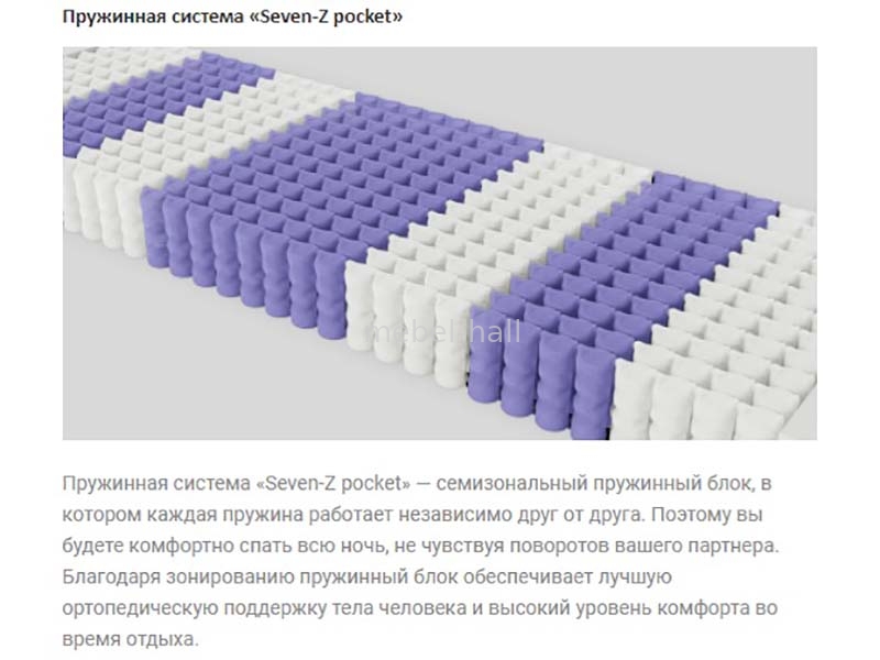 - Пружинная система «Seven-Z pocket» семизональный пружинный блок, в котором каждая пружина работает независимо друг от друга. Поэтому вы будете комфортно спать всю ночь, не чувствуя поворотов вашего партнера. Благодаря зонированию пружинный блок обеспечивает лучшую ортопедическую поддержку тела человека и высокий уровень комфорта во время отдыха.
