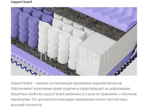 - Support board важная составляющая пружинных моделей матрасов. Обеспечивает укрепление краев изделия и предотвращает их деформацию. Защитные свойства support board увеличено в 2 раза по сравнению с обычным евробортом. Это достигается благодаря применению более толстой пены высокой плотности.