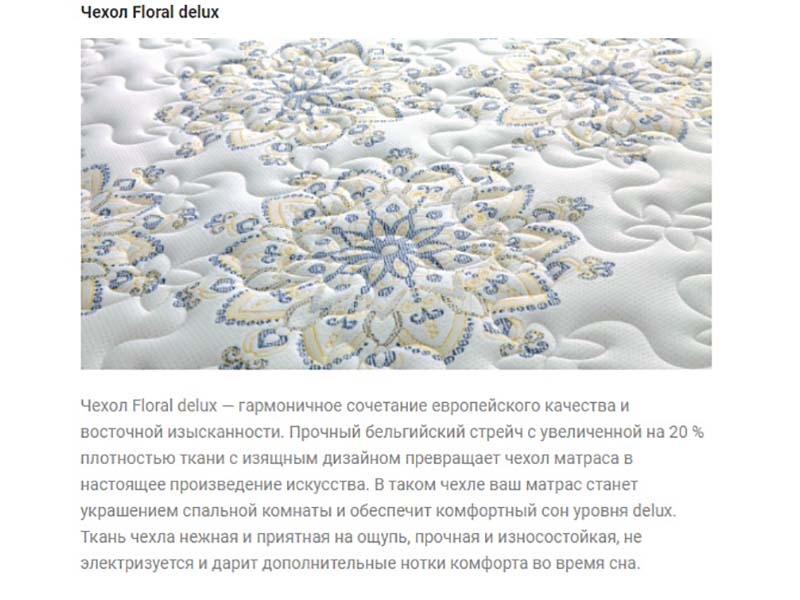 - Чехол Floral delux гармоничное сочетание европейского качества и восточной изысканности. Прочный бельгийский стрейч с увеличенной на 20% плотностью ткани с изящным дизайном превращает чехол матраса в настоящее произведение искусства. В таком чехле ваш матрас станет украшением спальной комнаты и обеспечит комфортный сон уровня delux. Ткань чехла нежная и приятная на ощупь, прочная и износостойкая, не электризуется и дарит дополнительные нотки комфорта во время сна.