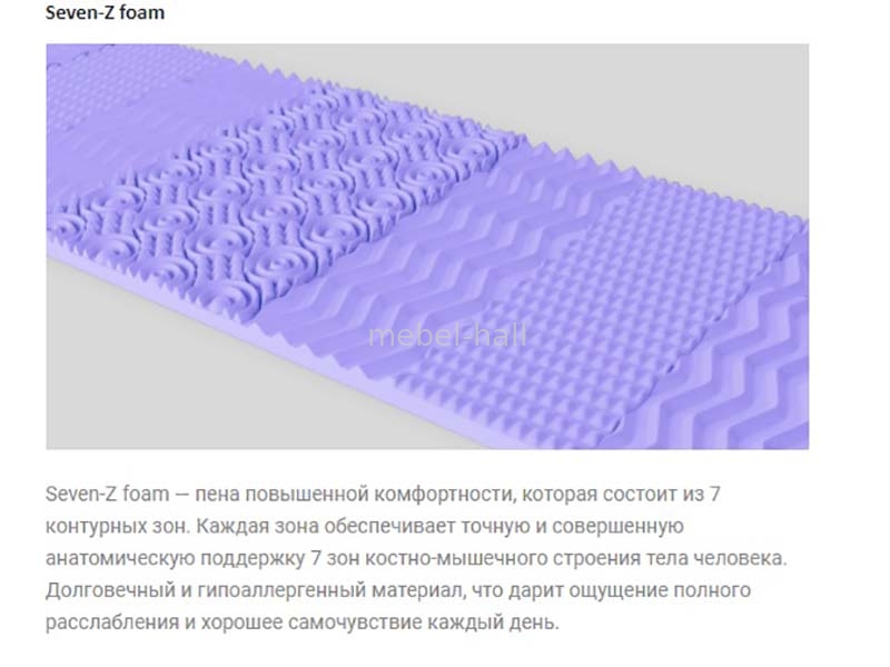 - Seven-Z foam пена повышенной комфортности, которая состоит из 7 контурных зон. Каждая зона обеспечивает точную и совершенную анатомическую поддержку 7 зон костно-мышечного строения тела человека. Долговечный и гипоаллергенный материал, что дарит ощущение полного расслабления и хорошее самочувствие каждый день.