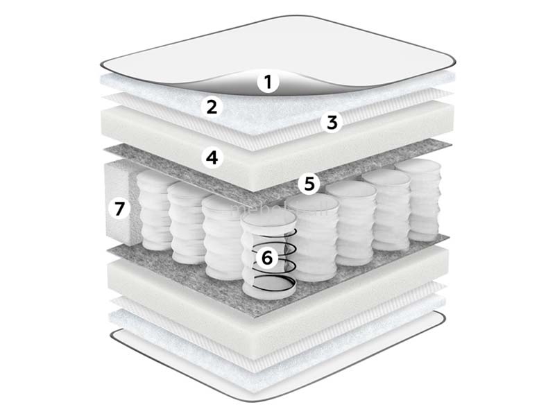 - Евроборт из пены по периметру. Борт из пены высокой плотности, установленный по периметру пружинного блока. Он предназначен для дополнительного усиления краев матраса и предупреждения их деформации. Благодаря применению евроборта вдвое увеличивается прочность и жесткость по периметру изделия, поддерживается его правильная форма. Это продлевает срок эксплуатации матраса.