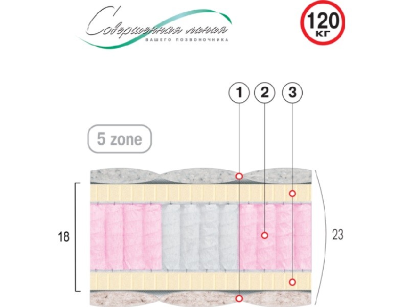 - Пятизонный независимый пружинный блок Pocket Spring разной упругости "MZPS" (Multi-Zone Pocket Spring).(диаметр опорного витка пружины - 43 мм; толщина - 1,3/1,4 мм; высота - 120 мм; плотность пружин от 500 шт/мІ) (5)