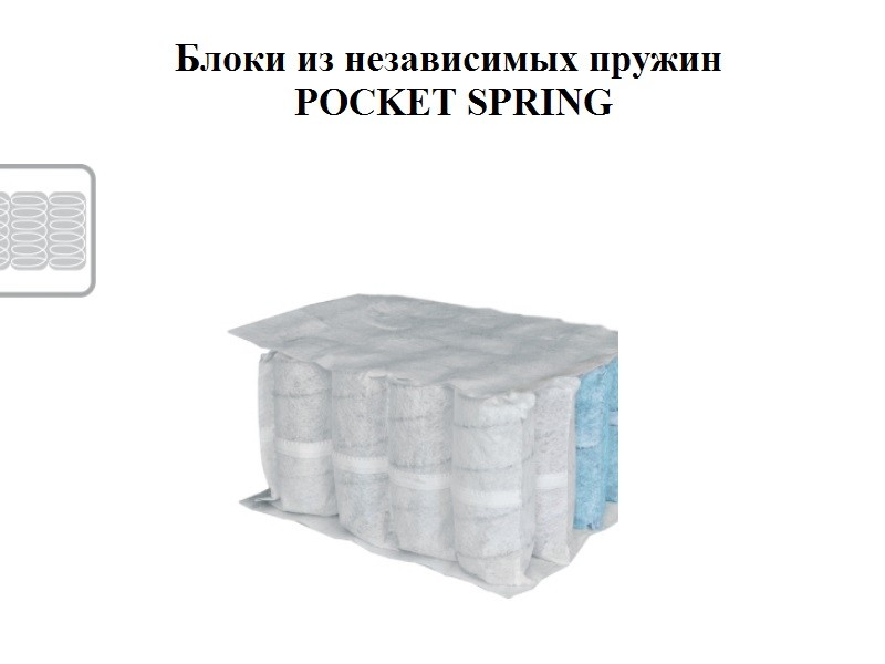 4. Независимый пружинный блок Pocket Spring разной упругости - блок независимых пружин, в котором каждая пружина помещена в отдельный мешочек и прогибается независимо от остальных. Такая структура позволяет равномерно распределять давление на туловище человека и точечно поддерживать позвоночник в анатомически правильном положении. Это создает ярко выраженный ортопедический эффект и гарантирует здоровый и комфортный сон. Для создания различных зон упругости или целых блоков повышенной жесткости применяется проволока различной толщины (диаметра), используются пружины разных диаметров. Чем меньше диаметр пружины, (чем она тоньше), тем больше проявяется эластичность блока пружин.