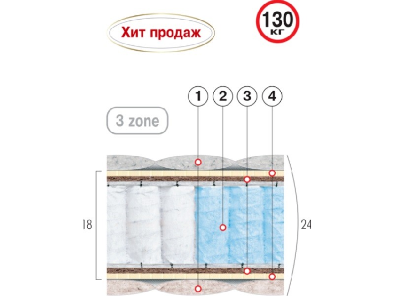 - Трехзонный независимый пружинный блок Pocket Spring разной упругости (диаметр опорного витка пружины - 63 мм; толщина - 1,8/1,9 мм; высота - 150 мм; плотность пружин от 250 шт/м2) (6)