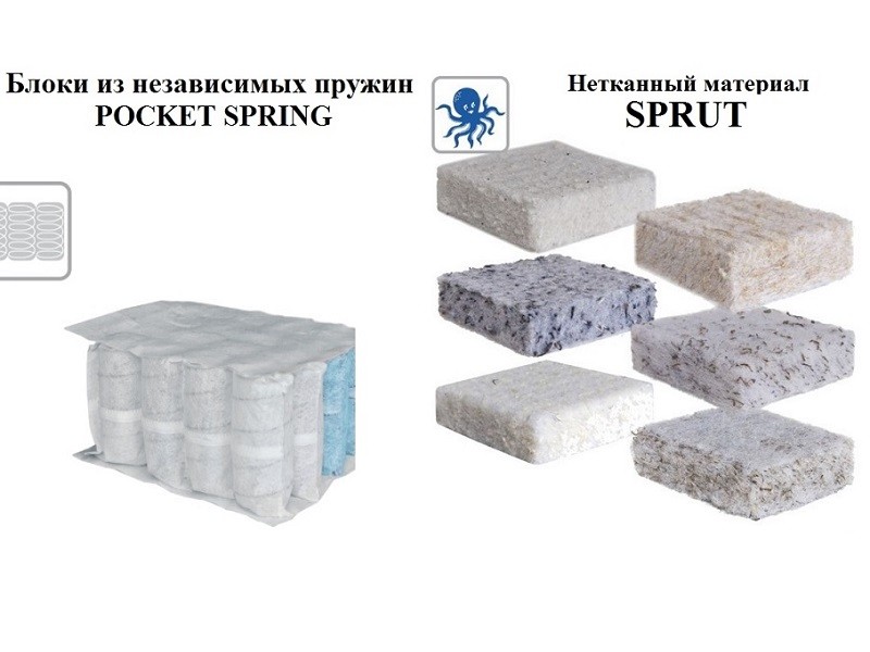 3. Sprut - объемный нетканый волокнистый настилочный материал. Отличается способностью увеличивать эффект упругости и долговечность поверхностей матраца. Технология сочетания ПЭТ волокон с волокнами хлопка, шерсти, конопли создает определяющие качества материалов для матрацев: максимальную степень воздухопроницаемости, теплогенерации и теплообмена. Материалы экологически безопасны, подвергнуты высокотемпературному воздействию.