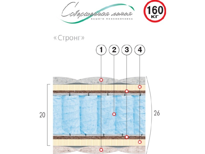 Основа пружинного матраса «СТРОНГ» - усиленный пружинный блок «Pocket Spring». Конструкция обеспечивает комфортный сон для людей солидной комплекции. Это достигается за счет использования усиленных пружин и комбинации настилов жесткой кокосовой койры и эластичного латекса. Специальный трикотаж выстеган вместе с объемным наполнителем по технологии глубокого стегания. Наличие в наполнителе чехла волокон шерсти и хлопка (с разных сторон) создает эффект «Зима-Лето».