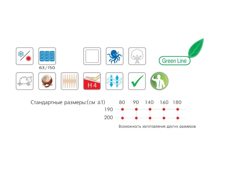 | Размер матраса, см: | 180х200, 180х190, 160х200, 160х190, 140х200, 140х190, 90х200, 90х190, 80х200, 80х190 |