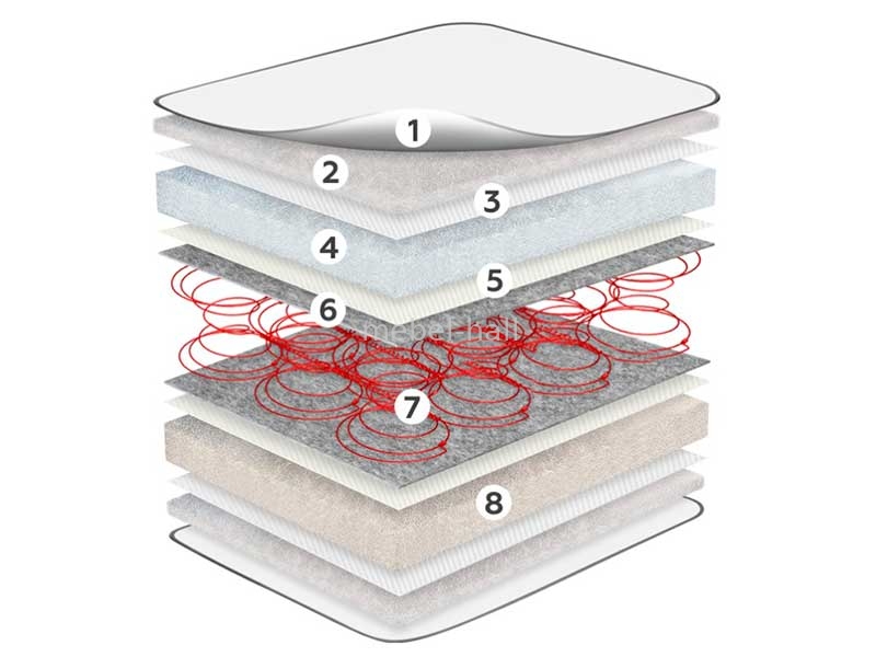 6. Усиленный зависимый пружинный блок Strengthened Bonnel - блок конусообразных зависимых пружин одинаковой жесткости способен выдерживать большие нагрузки. Для создания усиленной пружины, применяется пружина меньшего диаметра Ш 80мм (обычный диаметр пружины Ш 90мм.) Таким образом достигается огромная плотность пружин на кв. м от 130шт. Это делает блок более жестким и прочным, что гарантирует поддержку позвоночника при высоком давлении.