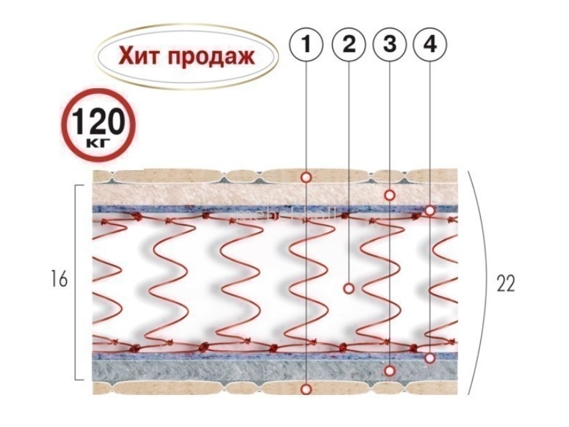 - Усиленный зависимый пружинный блок Bonnel (диаметр опорного витка пружины - 80 мм, высота пружины - 140 мм; плотность от 130 шт/м2) (4)