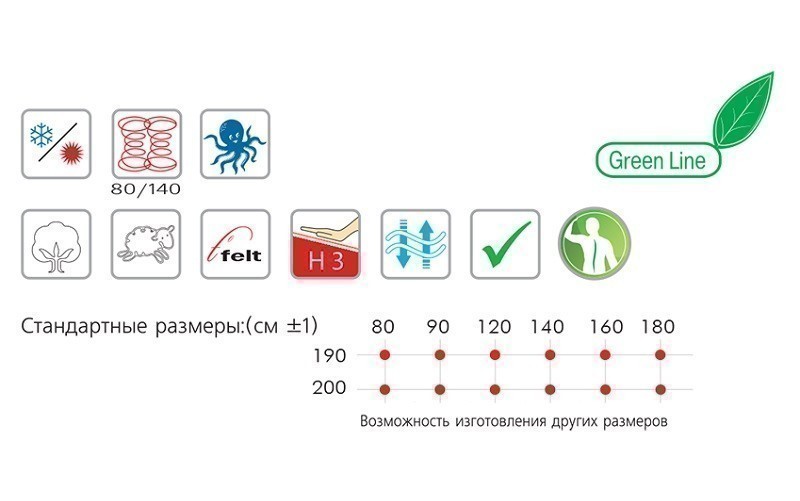| Размер матраса, см: | 180х200, 180х190, 160х200, 160х190, 140х200, 140х190, 120х200, 90х200, 90х190, 80х200, 80х190 |