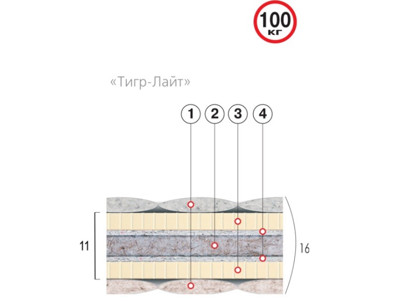 Если Вам нужен невысокий матрас, обратите внимание на «ТИГР-ЛАЙТ». Специально разработанный нетканый материал с волокнами кокоса, в сочетании с эластичными латексными настилами и жестким нетканым материалом «Thermofelt», создают уникальную систему поддержки тела. Абсолютная воздухопроницаемость и теплопроводность. Объемная и мягкая структура трикотажа, из которого выполнен стеганый чехол, придают матрасу дополнительный комфорт.