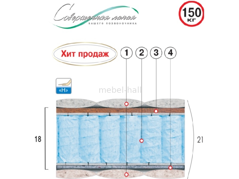 - Усиленный независимый пружинный блок Pocket Spring (диаметр опорного витка пружины - 63 мм; толщина - 1,9 мм; высота - 150 мм; плотность пружин от 250 шт/мІ) (4)