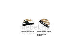 В основании каркаса - кровати находится металлический каркас (откуда взялось название), к которому крепятся к ламели. Ламели изготовлены из буковой гнутоклееной фанеры шириной 53 мм и толщиной 8 мм. Они закреплены на каркасе так, чтобы они были слегка выпуклыми. При нагрузке ламели, благодаря своей гибкости, выпрямляются, создавая плоскую поверхность. Если каркас рассчитан на двуспальную кровать, то он оборудован двумя рядами ламелей. Каркас выполнен из металлического профиля 25 мм х 25 мм х 1,5 мм, покрашенный порошковой краской (стандартный цвет черный). В данном каркасе ламели находятся на расстоянии 6,5 см один от другого.