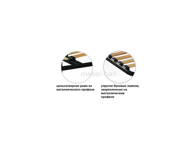 В основании каркаса - кровати находится металлический каркас (откуда взялось название), к которому крепятся к ламели. Ламели изготовлены из буковой гнутоклееной фанеры шириной 53 мм и толщиной 8 мм. Они закреплены на каркасе так, чтобы они были слегка выпуклыми. При нагрузке ламели, благодаря своей гибкости, выпрямляются, создавая плоскую поверхность. Если каркас рассчитан на двуспальную кровать, то он оборудован двумя рядами ламелей. Каркас выполнен из металлического профиля 25 мм х 25 мм х 1,5 мм, покрашенный порошковой краской (стандартный цвет черный). В данном каркасе ламели находятся на расстоянии 6,5 см один от другого.