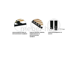 В основании каркаса - кровати находится металлический каркас (откуда взялось название), к которому крепятся к ламели. Ламели изготовлены из буковой гнутоклееной фанеры шириной 53 мм и толщиной 8 мм. Они закреплены на каркасе так, чтобы они были слегка выпуклыми. При нагрузке ламели, благодаря своей гибкости, выпрямляются, создавая плоскую поверхность. Если каркас рассчитан на двуспальную кровать, то он оборудован двумя рядами ламелей. Каркас выполнен из металлического профиля 25 мм х 25 мм х 1,5 мм, покрашенный порошковой краской (стандартный цвет черный). В данном каркасе ламели находятся на расстоянии 6,5 см один от другого.