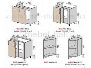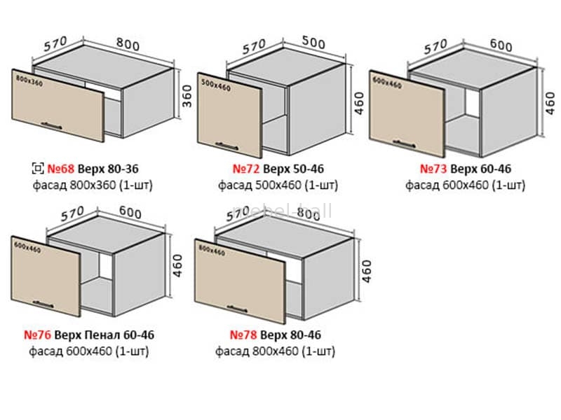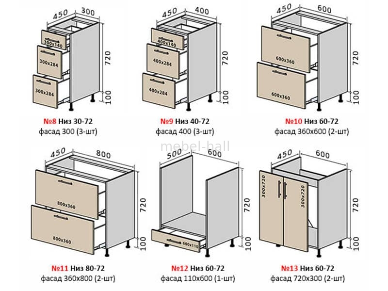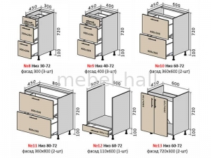 Предлагается 13 цветов фасадов на выбор: Серый, Оливковый, Голубой, Желтый, Ванильный, Оранжевый, Белый, Красный, Абрикосовый, Кофейный, Салатовый, Шоколадный, Сиреневый.