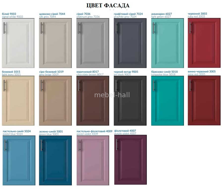 Фасад изготовлен из матового крашенного МДФ с фрезерованием в 16 эффектных цветах.