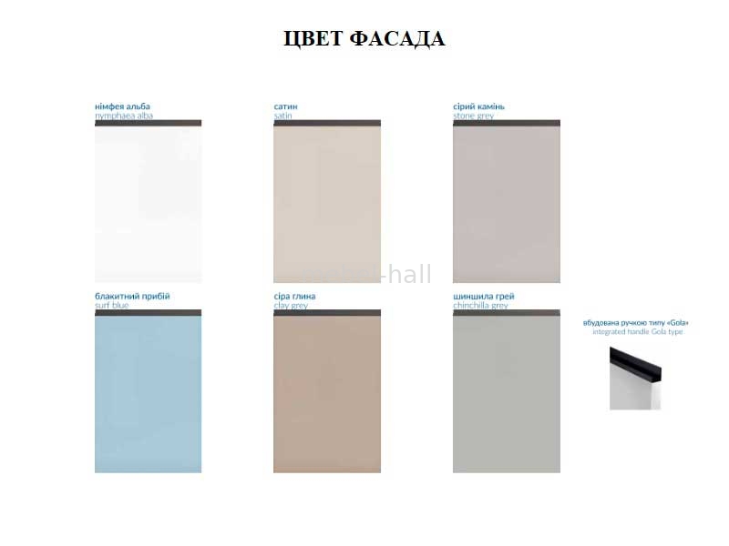 Фасад изготовлен из ламинированного ДСП с встроенной ручкой типа "Gola"в 6 цветах.