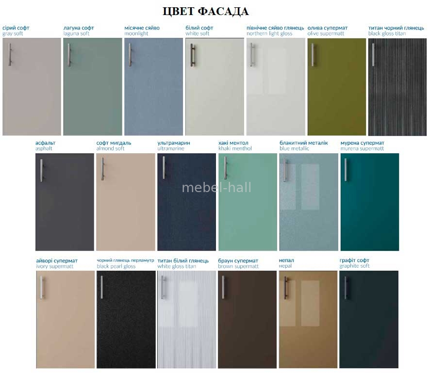 | Цвет фасадов: | Мурена Супермат, Титан Белый Глянец, Северное Сияние Глянец, Айвори Супермат, Титан Черный Глянец, Черный Глянец Перламутр, Браун Супермат, Олива Супермат, Белый Софт, Графит Софт, Голубой Металлик, Непал, Серый Софт, Лагуна Софт, Лунное Сияние, Асфальт, Миндаль Софт, Ультрамарин, Хаки Ментол |