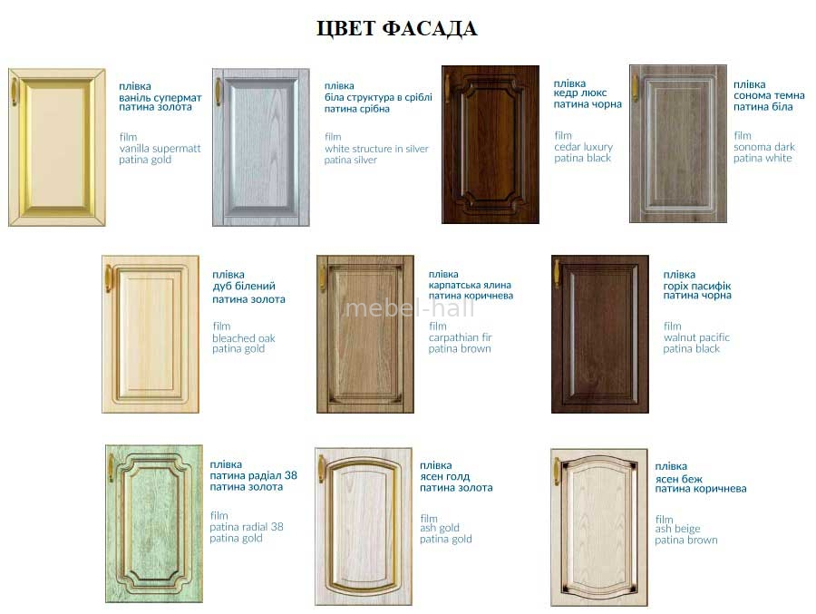 Фасад изготовлен из качественного пленочного МДФ 19 мм с фрезеровкой и патиной в 10 цветах.