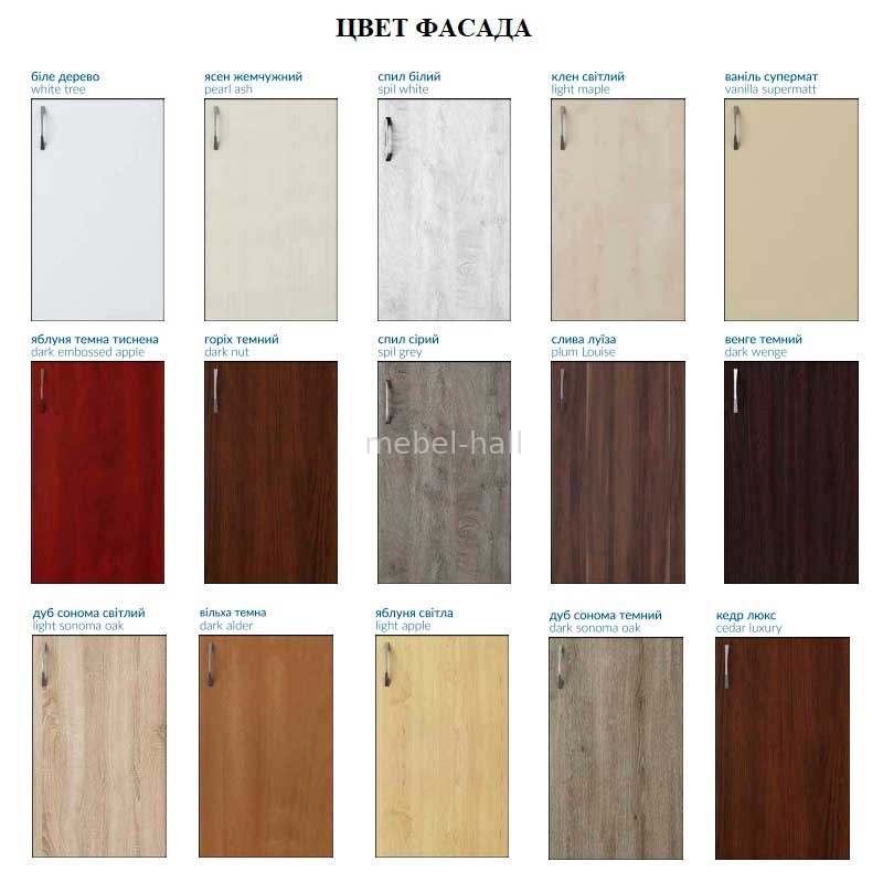 | Цвет фасадов: | Белое Дерево, Дуб Сонома Темный, Кедр Люкс, Слива Луиза, Спил Серый, Дуб Сонома Светлый, Ольха Темная, Ваниль Супермат, Спил Белый, Орех Темный, Яблоня Темная Тисненая, Яблоня Светлая, Клен Светлый, Ясень Жемчужный, Венге Темный |