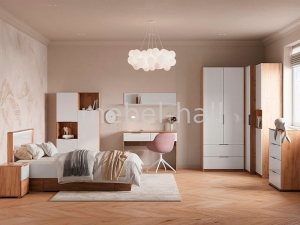 Мебель выполнена в современном стиле с сочетанием белого глянца на фасадах и древовидной текстуры дуба от украинской мебельной фабрики MiroMark. Привлекательный дизайн, новейшие тенденции, помогут оформить стильный интерьер комнаты.