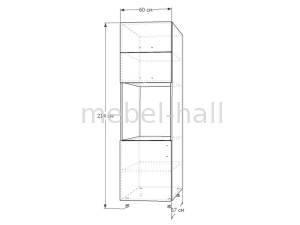 Пенал ПУ-60х214 2 с одной дверью внизу и двумя дверьми сверху, открывающимися вверх, и открытой полкой для духовки.