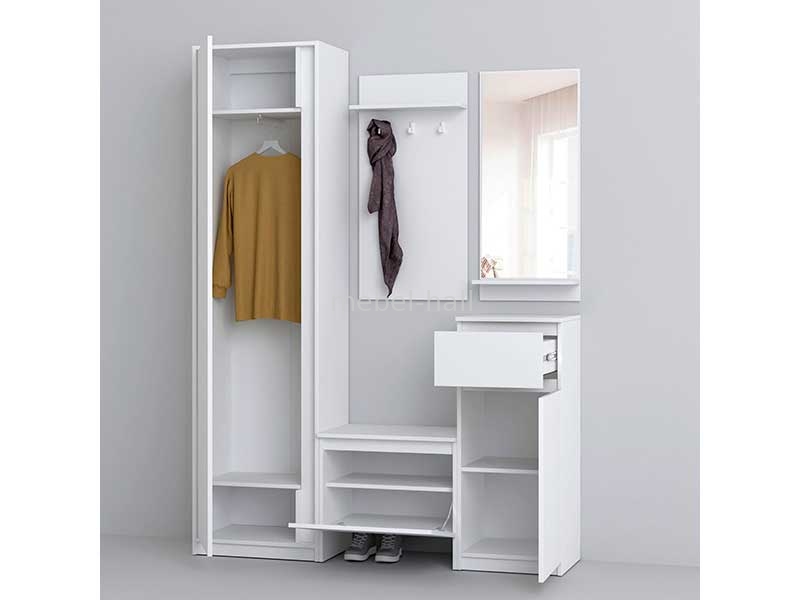 Прихожая с шкафом, тумбой для обуви, вешалкой, тумбой комодом, зеркалом и шкафом Брайт Мастер Форм 1470х376х2000h мм ДСП Белый