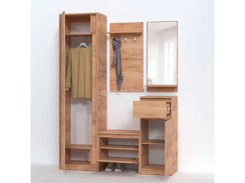 Прихожая с шкафом, тумбой для обуви, вешалкой, тумбой комодом, зеркалом и шкафом Брайт Мастер Форм 1470х376х2000h мм ДСП Дуб Крафт Золото