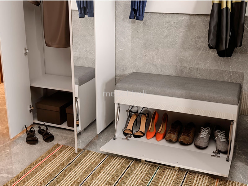 | Особенности: | С подушкой, С отсеком для обуви, С шкафом, С крючками, С шухлядами, На ножках, С зеркалом |