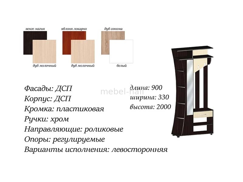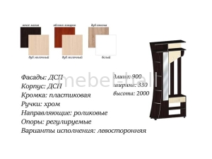 Фасад и корпус выполнен из ламинированного ДСП в сочетании цветов Венге Магия/Дуб Молочный, Дуб Сонома/Белый, Яблоня Лорано/Дуб Молочный.
