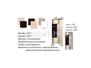 Фасад и корпус выполнен из ламинированного ДСП в сочетании цветов Венге Магия/Дуб Молочный, Дуб Молочный/Венге Магия, Дуб Сонома/Белый.
