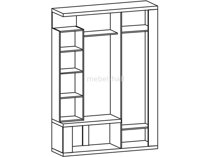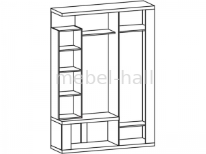 Прихожая имеет 3 секции: шкаф с зеркалом и 4 полками; полка сверху, вешалка с крючками и отделение для обуви; шкаф с штангой для вешалок и полками сверху и снизу.