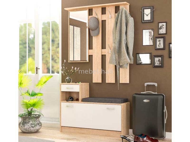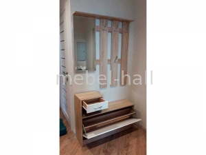 Прихожая имеет вешалку с крючками и зеркало, тумбу с 2 отделениями для обуви, открытой полкой и выдвижным ящиком. Шкаф можно разместить в любом месте. Внутри шкаф имеет штангу для вешалок и полки сверху и снизу.