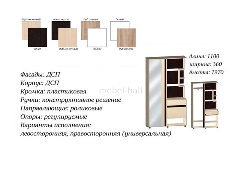 Фасад и корпус выполнен из ламинированного ДСП в сочетании цветов Венге Магия/Дуб Молочный, Дуб Молочный/Венге Магия, Дуб Сонома/Белый, Белый/Дуб Сонома.