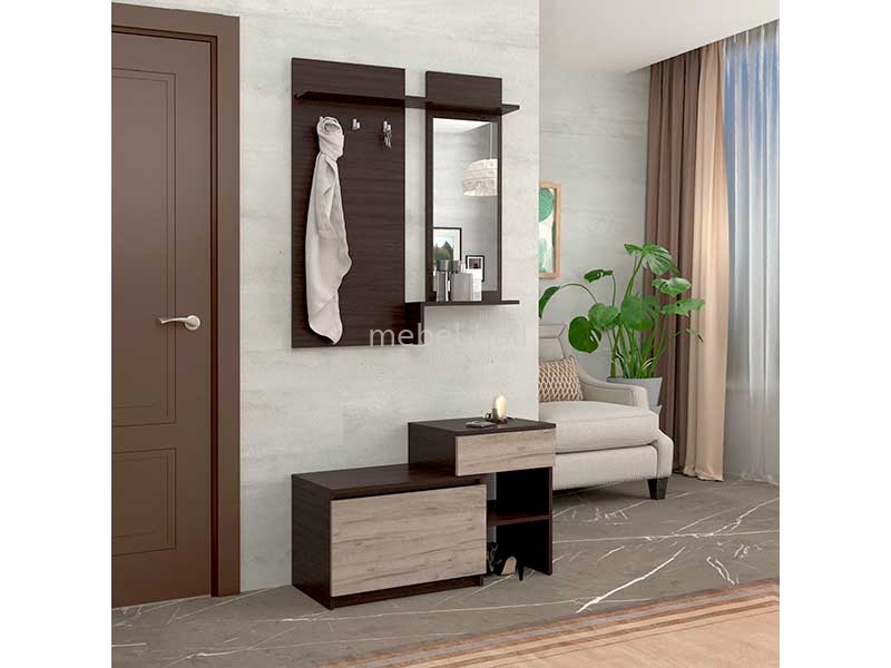 Прихожая с тумбой для обуви и вешалкой с зеркалом Брайт Мастер Форм 900х376х2000h мм ДСП Дуб Крафт Серый / Венге Магия правосторонняя