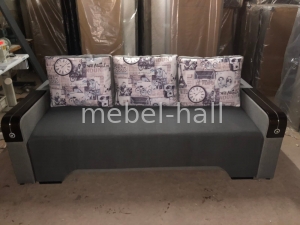 Прямая модель раскладного дивана с подлокотниками из гнутого МДФ, покрытого шпоном ясеня.