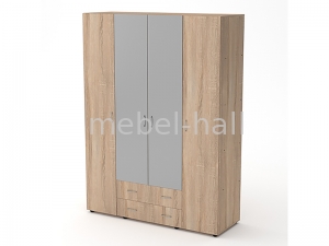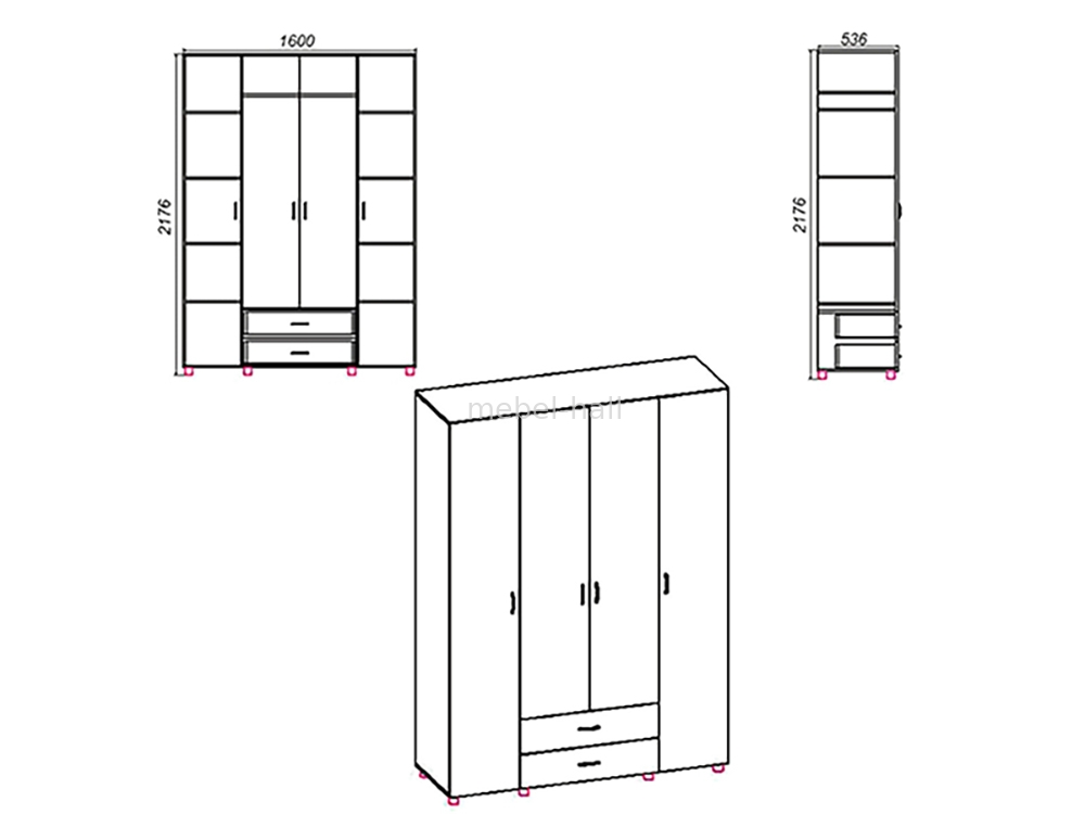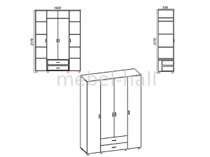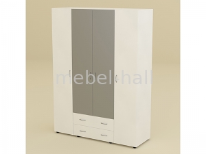 Данная модель шкафа собирается на специальных регулируемых ножках. Мебельная конструкция состоит из пяти автономных отделений, предназначенных для компактного хранения разных вещей. В правой и левой части шкафа находятся полочки, на которых можно расположить одежду в сложенном виде. Большая секция, которая расположена по центру, оснащена микролифтом, позволяющим бережно хранить необходимое количество вещей на вешалках. Сверху и внизу мебельного гарнитура имеются полочки, которые отлично подойдут для хранения одеял и подушек.
