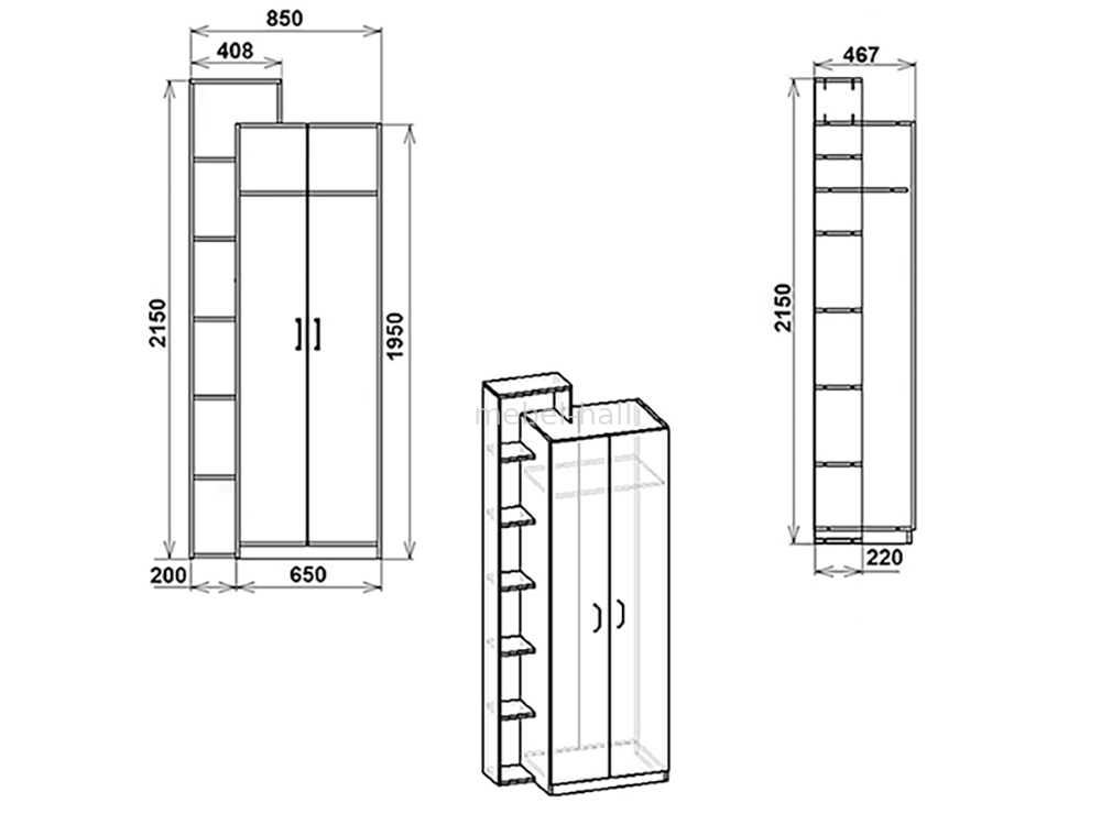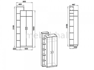 Размеры непосредственно шкафа (без внешних полок): ширина - 65 см, высота - 195 см.