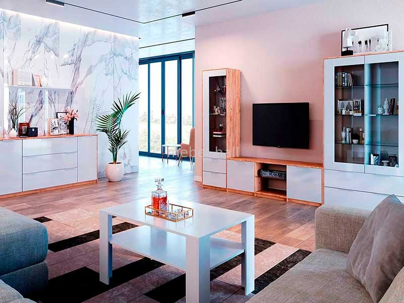 Мебель выполнена в современном стиле с сочетанием белого глянца на фасадах и древовидной текстуры дуба от украинской мебельной фабрики MiroMark. Привлекательный дизайн, новейшие тенденции, лаконичность, функциональность, качественные материалы и фурнитура, помогут легко оформить стильный интерьер комнаты.