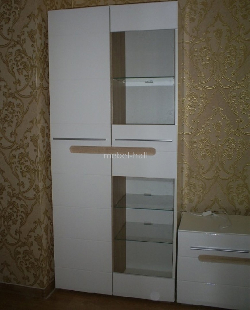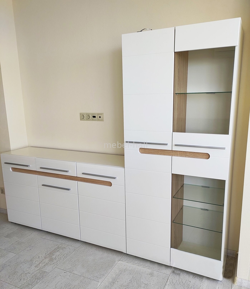 Фасад выполнен из МДФ в цвете Белый Глянец + вставки ДСП в цвете Дуб Сонома.