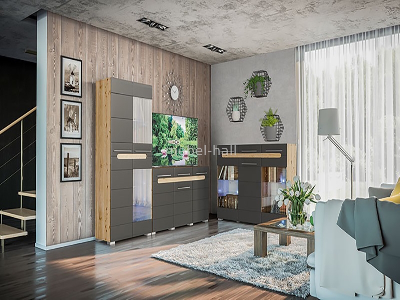 Фасад выполнен из МДФ в цвете Графит + вставки ДСП в цвете Дуб Артизан.