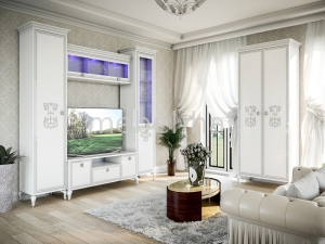Шкаф 2Д ВЕРОНИКА СВІТ МЕБЛІВ изысканная мебель для гостиной, сочетающая в себе элегантность и функциональность. Белые лаковые фасады, украшенные художественной печатью, массивные карнизы, изогнутые ножки и квадратные металлические ручки, придают элегантности и утонченности. Благодаря белоснежным фасадам, визуально расширяющим пространство, изделия модульной гостиной Вероника подойдут для обустройства гостиной любого размера. Такая мебель станет не только украшением дома, но и подчеркнет утонченный вкус ее обладателей.
