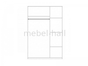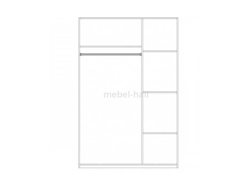 Внутри шкаф имеет два отделения: в правом расположена штанга для вешалок и полка сверху, в левом - 4 полки одинаковой высоты.