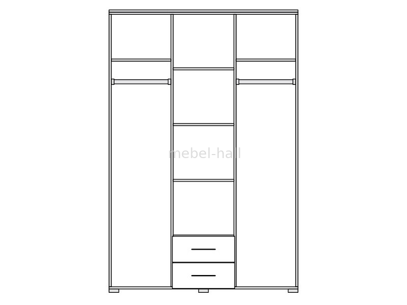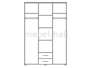 Внутри шкафа расположены 3 отделения. По бокам находятся штанги для вешалок и полка сверху. В среднем отделении расположены 4 полки и 2 выдвижных ящика.