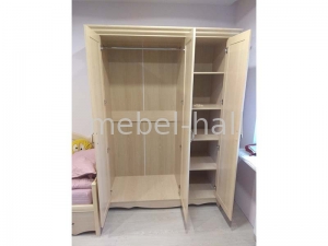 Шкаф внутри имеет в левом отделении штангу для вешалок, в правом - пять полок одинаковой высоты.