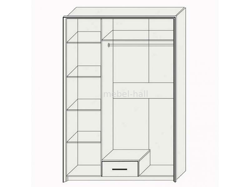 Шкаф подходит для хранения любых вещей и включает в себя отделение с штангой для вешалок и полкой сверху и отделение с пятью полками, а также один выдвижной ящик снизу.