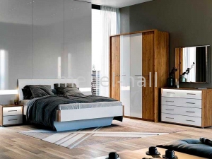 Модульная мебель для спальни Ники в современном стиле, с гармоничным сочетанием белоснежных глянцевых фасадов и корпуса в благородном натуральном дереве дуб крафт, от украинской мебельной фабрики MiroMark. Органичный дизайн, продолговатые уникальные металлические ручки, помогут оформить стильный интерьер спальной комнаты.